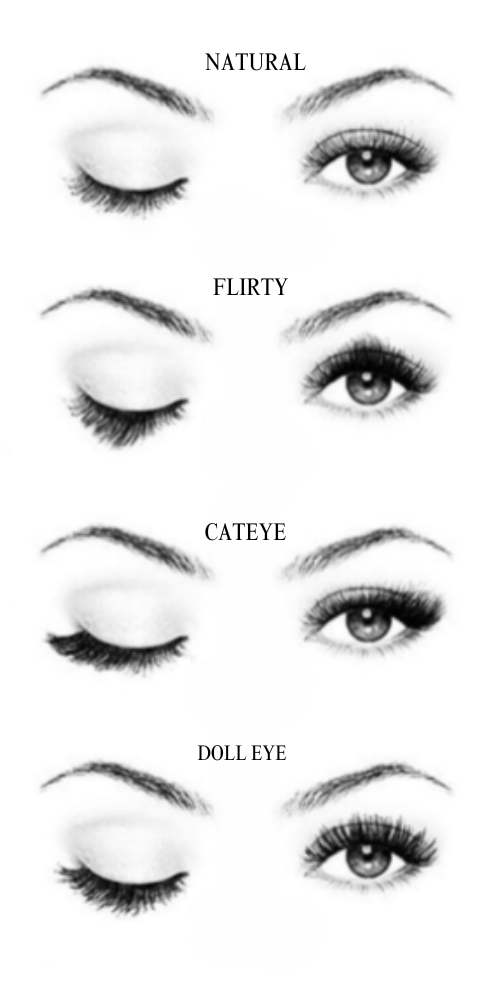 Doll Eye - This is a great option for people with hooded, deep set, protruding, upturned, and almond eyes. The longest lengths are usually in the center of the eye, making it appear wider.