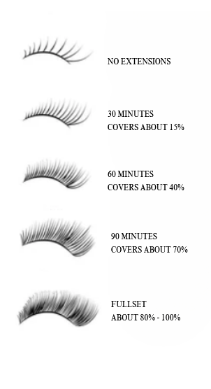 Last but not least, determine how natural or full you would like your lashes to be. Keep in mind, the longer the appointment time, the fuller they will be.